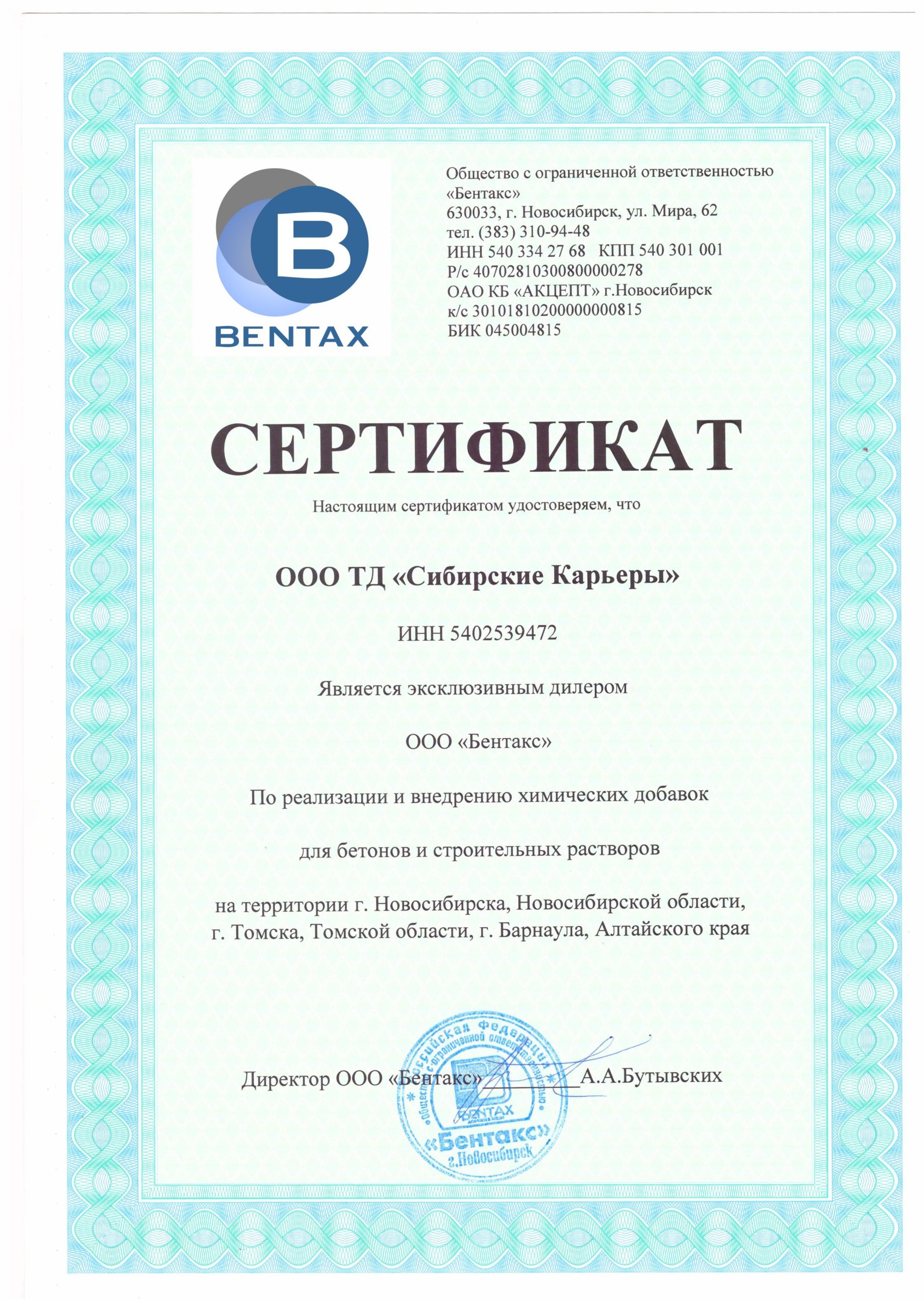 [su_column size=»1/3″] Все актуальные сертификаты и технические условия продукции под маркой «Бентакс» изготовлены и заявлены производителем химических добавок ООО «Бентакс» ИНН 5403342768. [/su_column]
